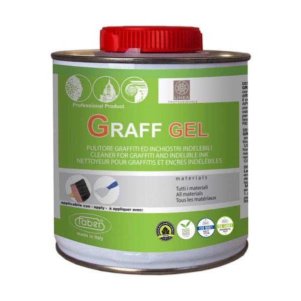 GRAFF GEL is a solvent-based product for the removal of paint, permanent inks, synthetic enamels, resins and graffiti. It acts by dissolving the synthetic top layers on a surface, bringing the treated material back into view without changing its appearance.